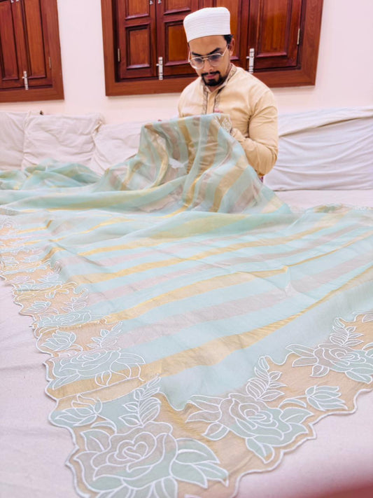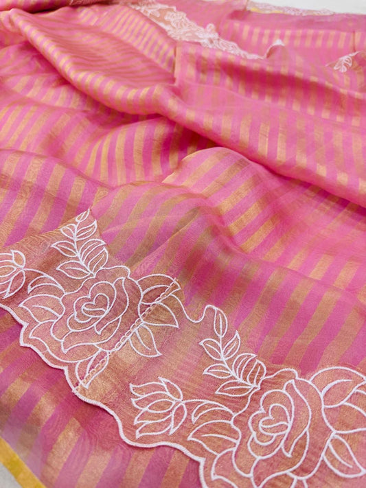 Pure Banarasi Tissue Silk Stripe Sarees With Applique Work