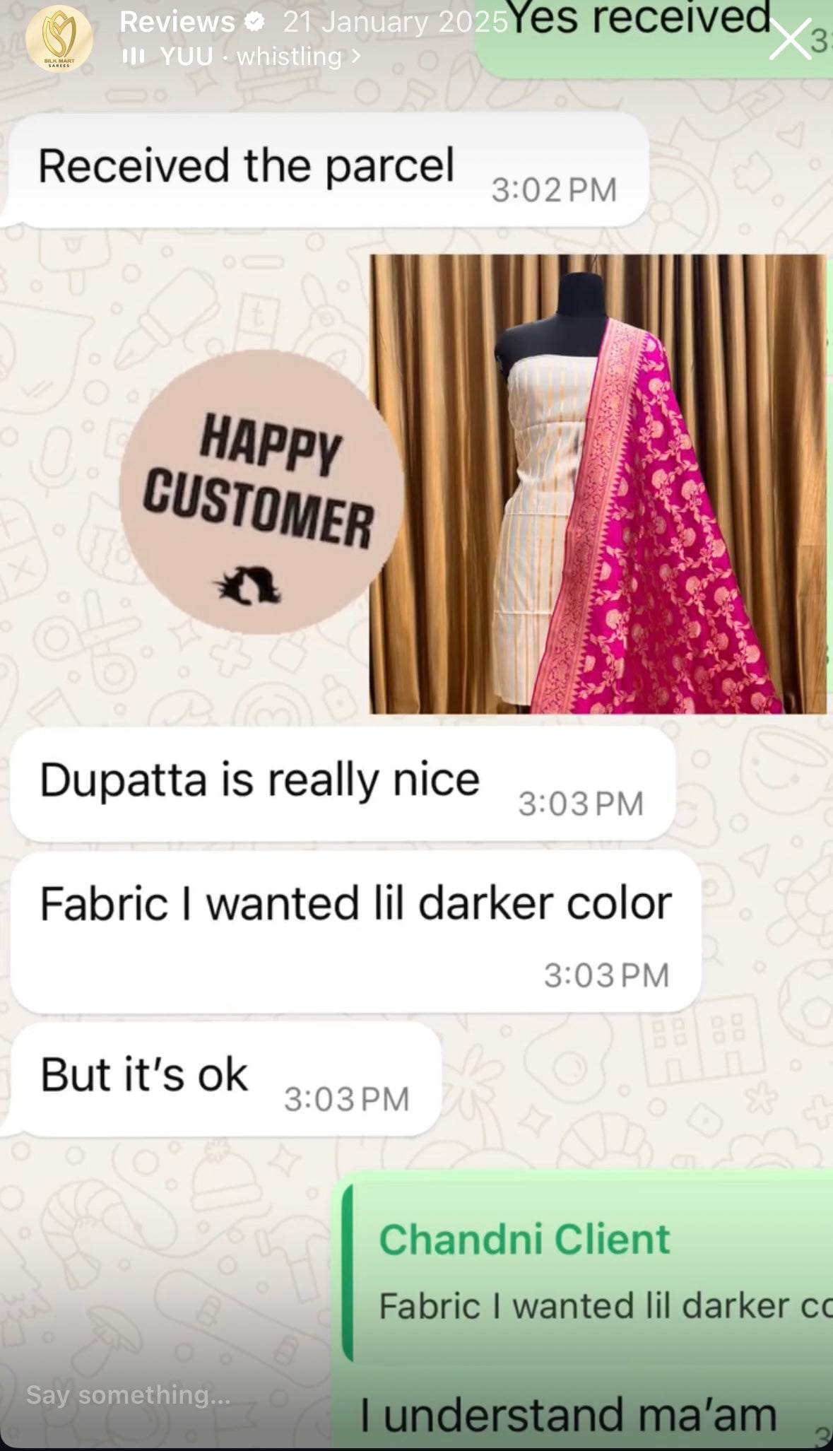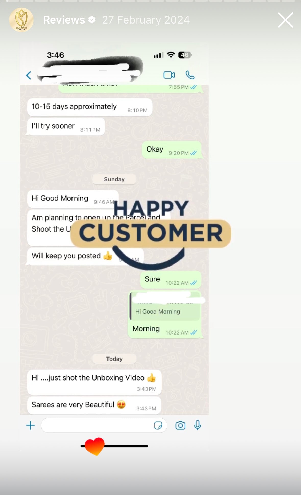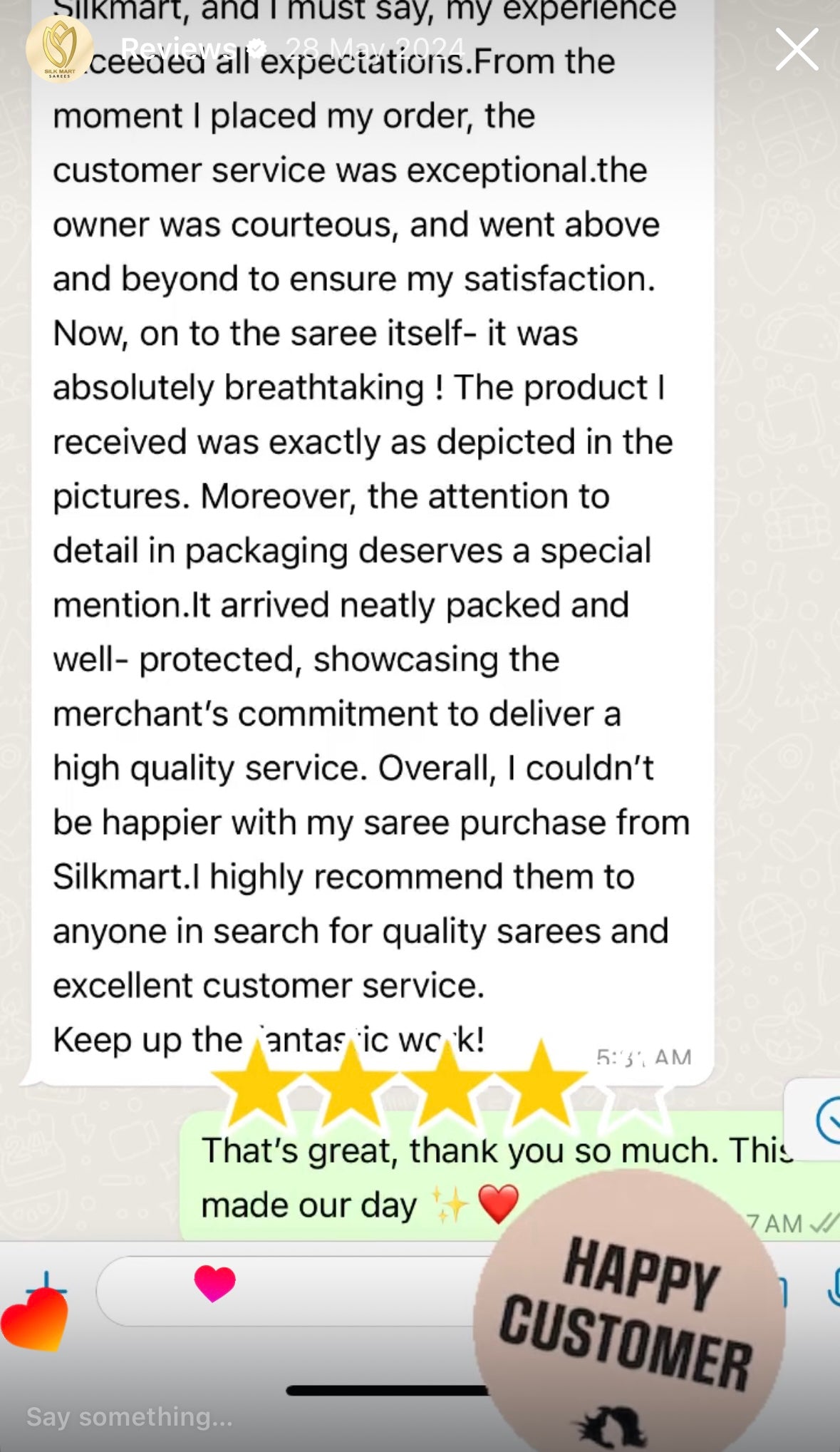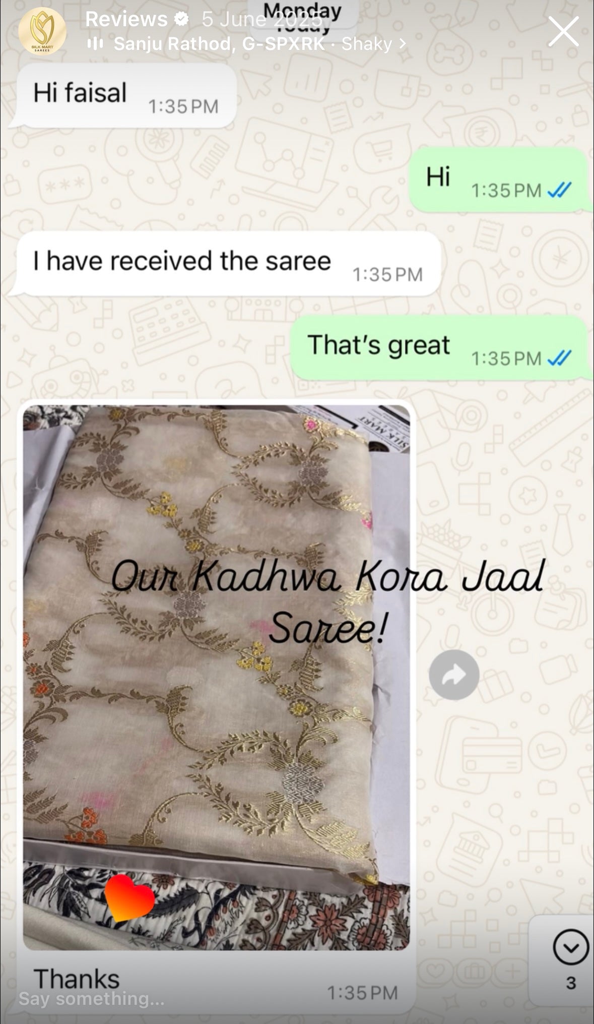 If a saree is not avilable in stock, for a cutwork saree, it will take 10-15 days and for a handwoven saree it will take atleast 30-45 days for weaving and fininshing