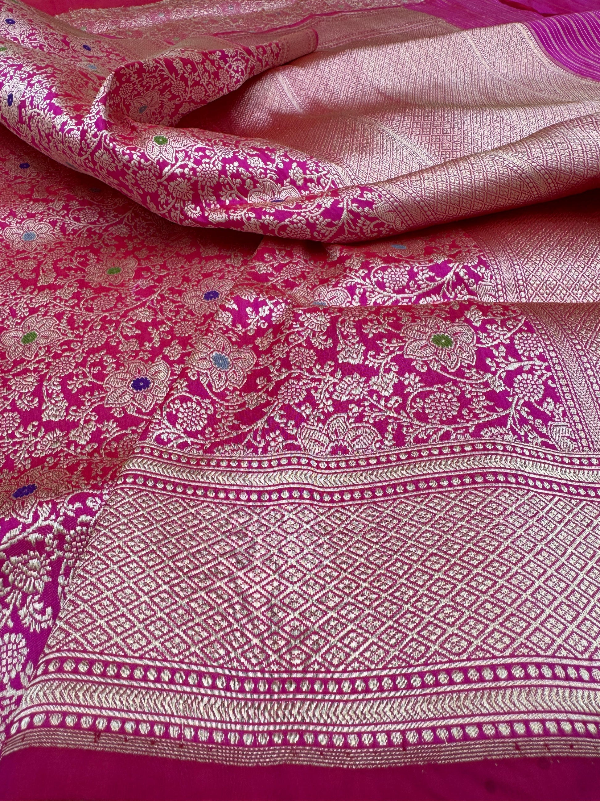 Step into grandeur with our Pure Banarasi Katan Silk Brocade Saree in a vibrant Rani Pink Colour hue. This saree showcases the traditional Banarasi brocade weaving, with intricate patterns woven in rich zari, creating a tapestry of elegance and sophistication. The luxurious Katan silk fabric offers a smooth texture and an exquisite drape, making it perfect for weddings, festive occasions, and grand celebrations. The Rani Color, combined with the detailed brocade work, adds a regal charm, ensuring you stand out with timeless grace and beauty.