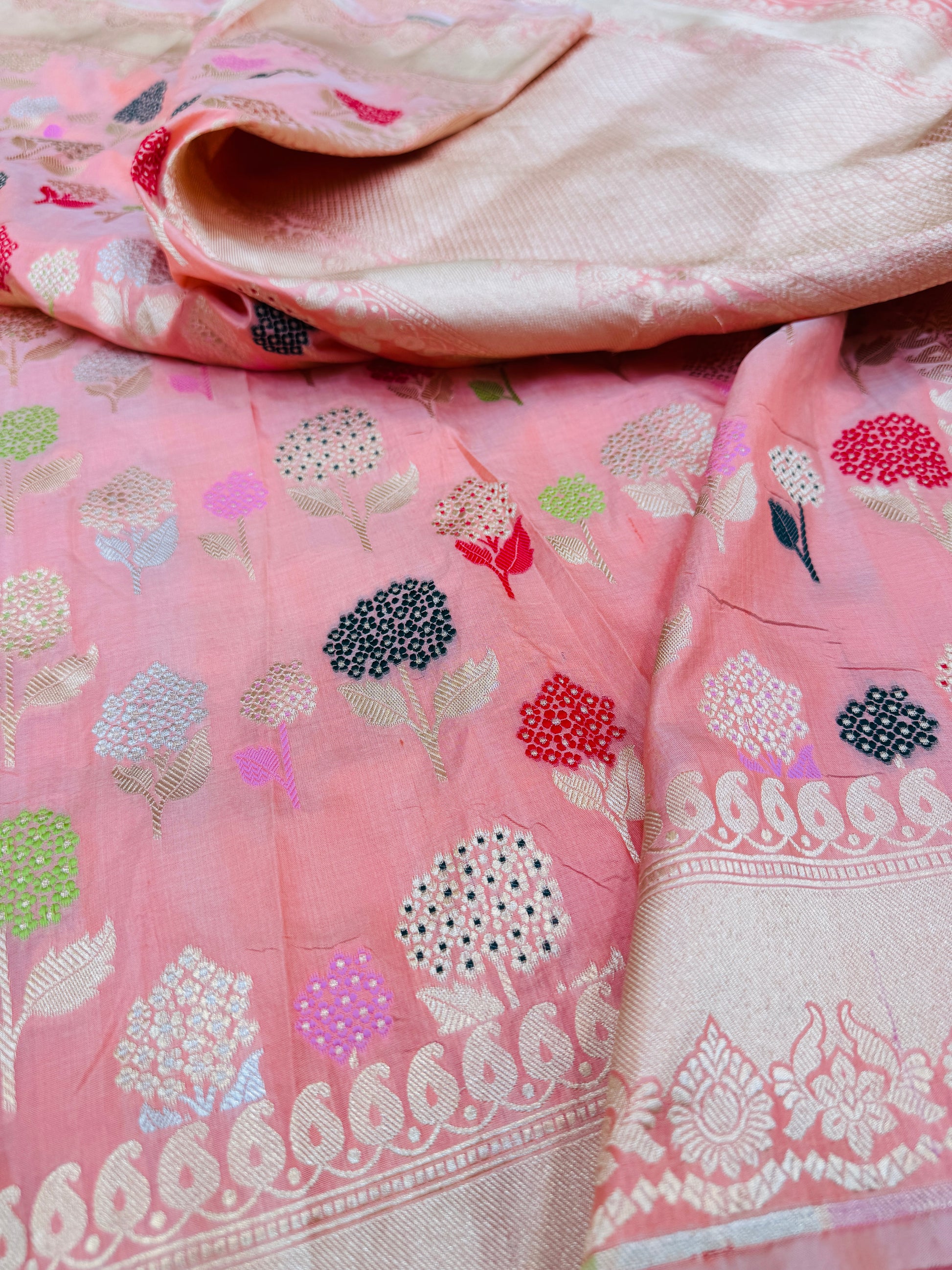 Experience timeless charm with this pink Katan Silk buti jaal Saree, woven with intricate zari artistry and radiant Banarasi craftsmanship.