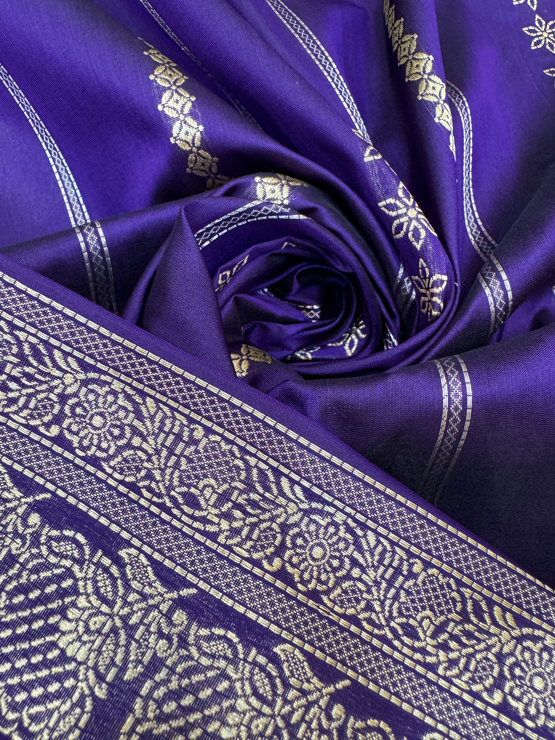 Immerse yourself in the elegance of tradition with our Pure Banarasi Katan Silk Kadhwa Mina Jaal Saree in a Dark Purple shade. This saree features the intricate Kadhwa Mina Jaal design, woven with precision and adorned with delicate multicoloured Mina work, reflecting the exquisite craftsmanship of Banarasi artisans. The luxurious Katan silk fabric offers a rich texture and graceful drape, making it a perfect choice for weddings, festive occasions, and special celebrations. The serene lavender hue, coupled with the elaborate Mina jaal, adds a touch of refined sophistication to this timeless piece.