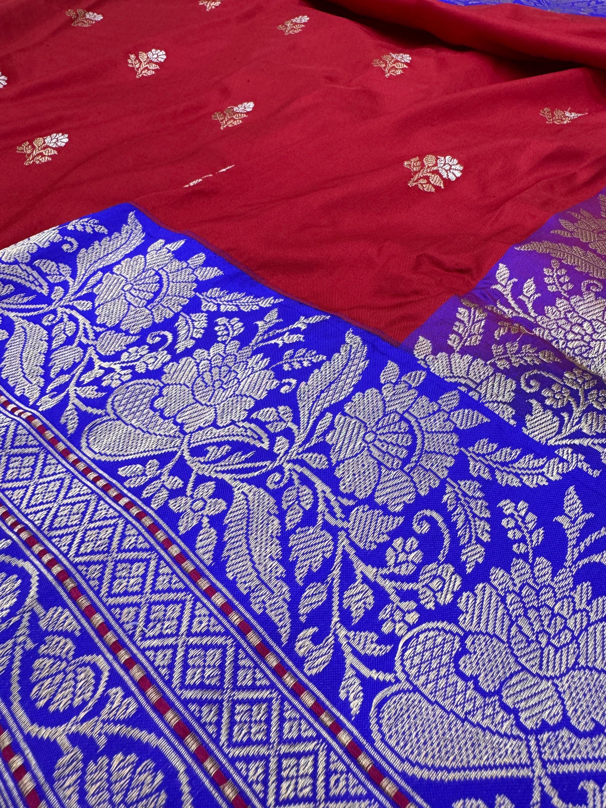 Drape yourself in sheer opulence with this Pure Banarasi Katan Silk Kadiyal Border Saree in a regal red nroyal blue hue . Crafted with the finest katan tissue silk, this saree shimmers with a natural glow, reflecting the grandeur of Banarasi weaving. The Kadiyal border technique adds a striking contrast, elevating the saree’s elegance while ensuring a structured and graceful drape. Perfect for weddings, festive occasions, and grand celebrations, this saree is a timeless treasure of tradition and sophistication.