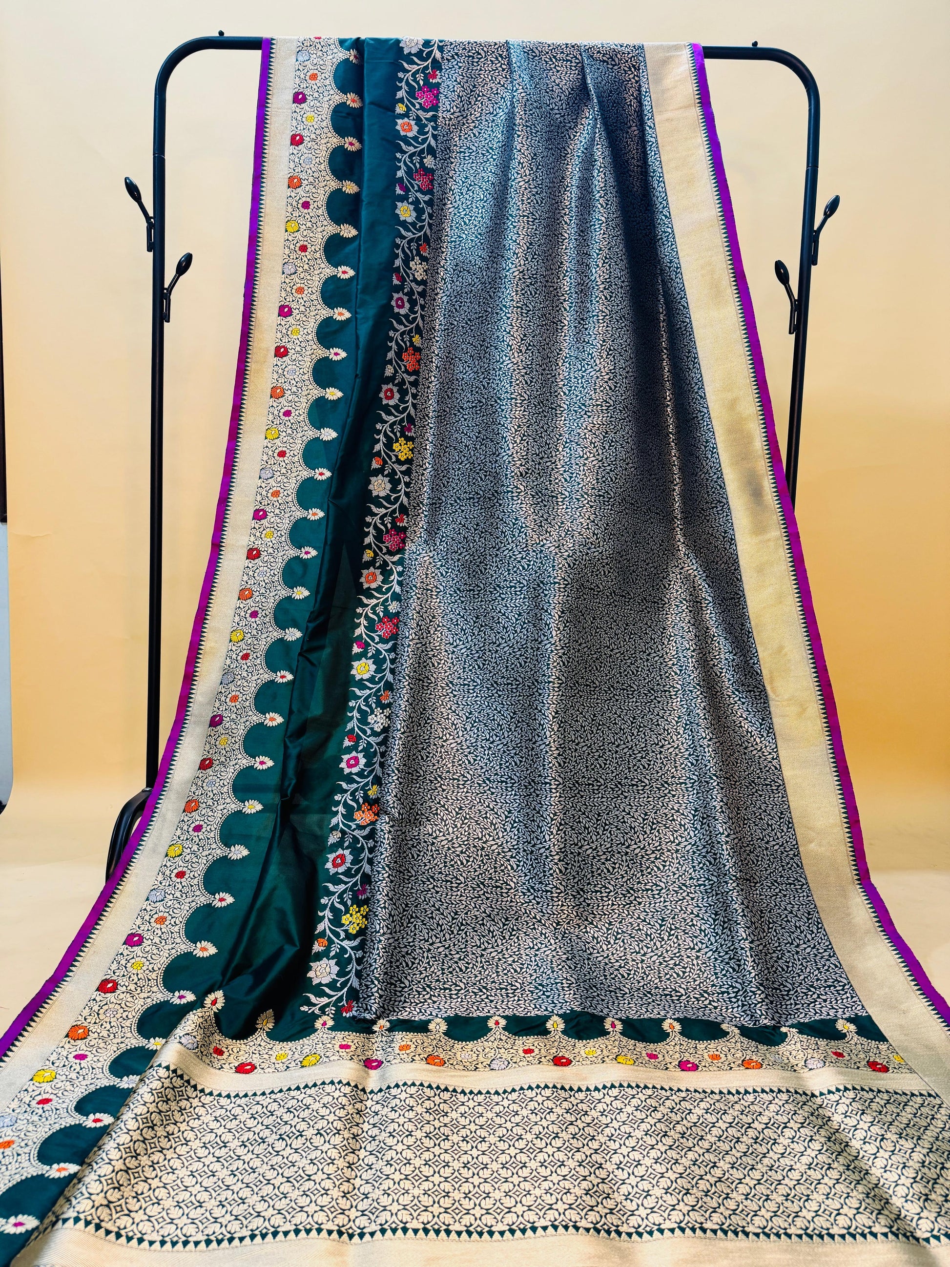 A Pure Banarasi Katan Silk designer brocade with scallop border saree is crafted from finely twisted pure silk threads known as Katan silk , which give the fabric a rich texture , durability and natural shine . The satin finish in black color hue enhances the smoothness and glossy appearance of the saree . One of the distinctive feature-is the Mina border which has jaal like pattern in skirt form all over the body adding elegance and uniqueness to the saree .