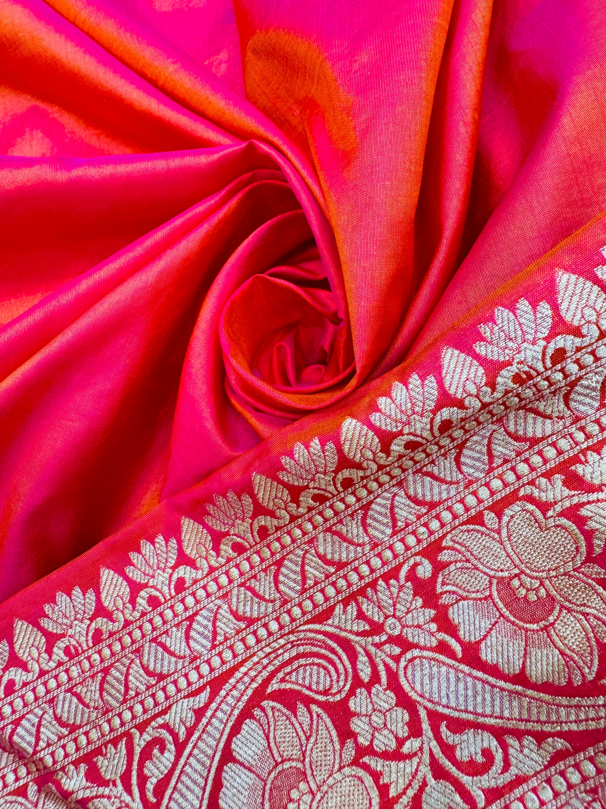 Turn heads with this exquisite Pure Banarasi Katan Silk Mina Jaal Saree in Rani Pink, a masterpiece of timeless Banarasi artistry. Handwoven using the kadhwa technique, it features intricate mina jaal motifs in fine zari that enhance its royal charm. The vibrant hot pink hue adds a bold yet elegant touch, making it perfect for weddings, festive occasions, and grand celebrations.