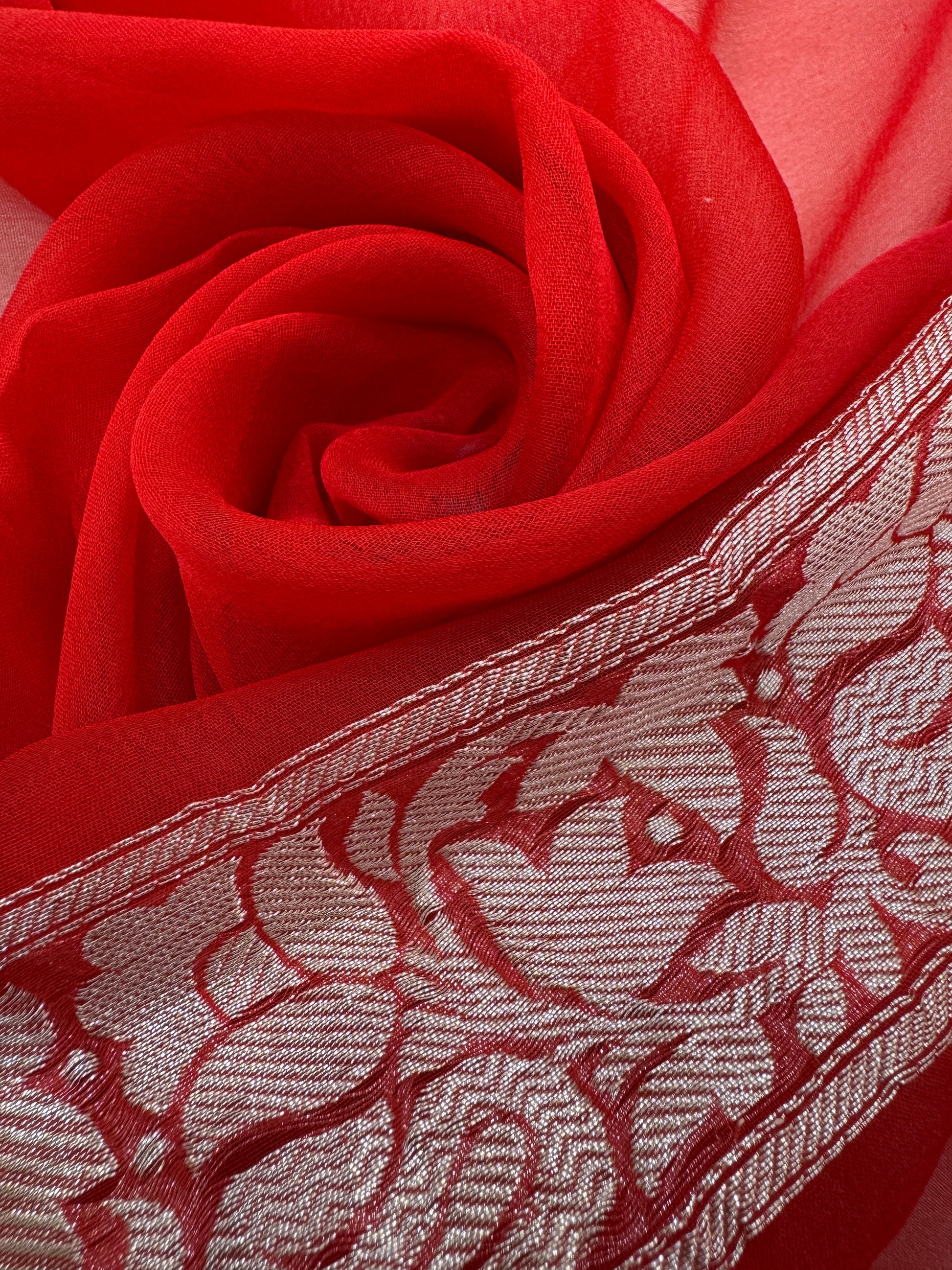 A bright red pure khaddi chiffon silk saree adorned with delicate butis — light, graceful, and effortlessly elegant.