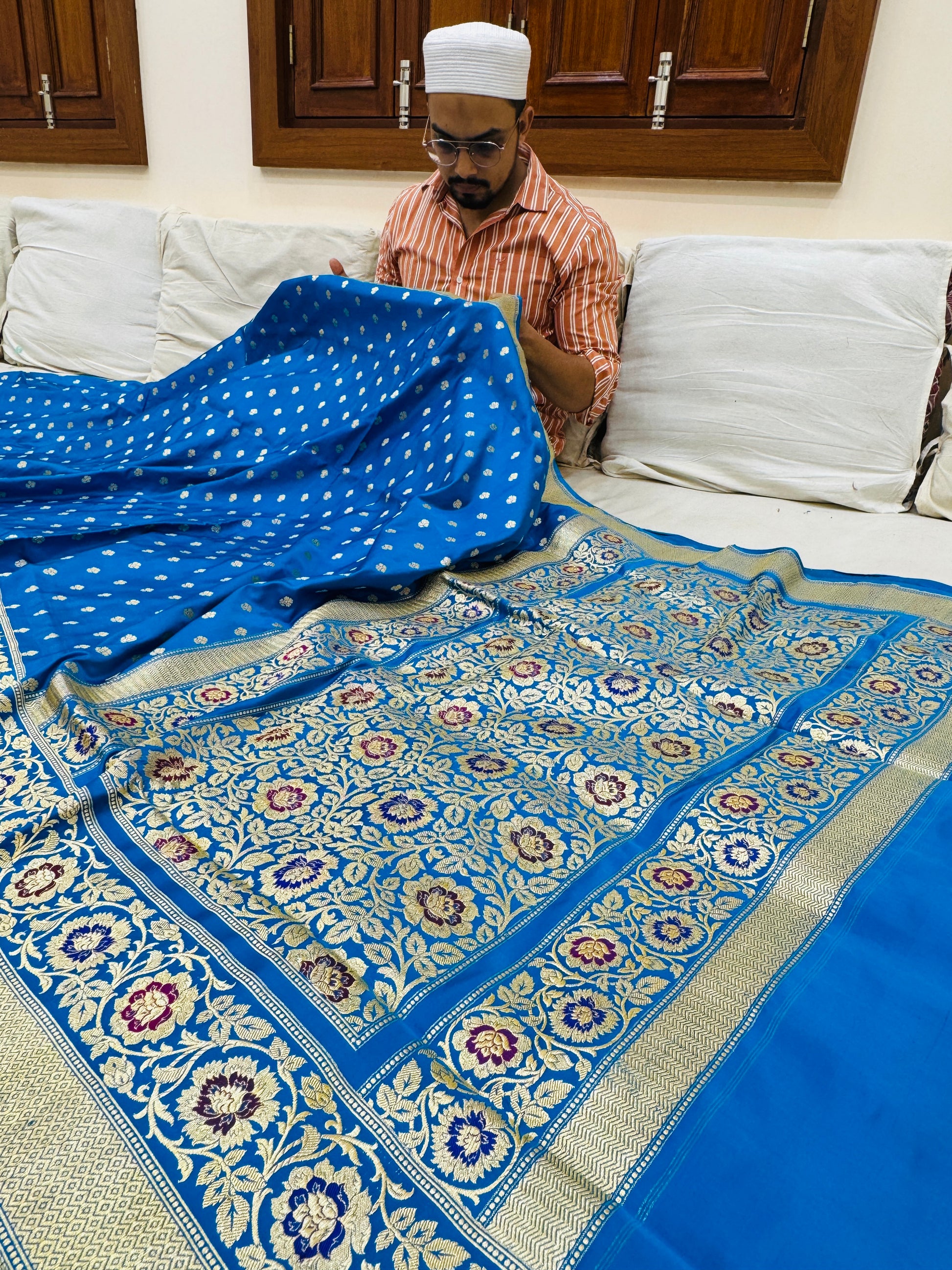 Embrace the allure of tradition with our Pure Banarasi Satin Silk Chunri Buti Saree in a rich sky blue shade. This saree features delicate chunri butis, meticulously handwoven, reflecting the timeless elegance of Banarasi craftsmanship. The luxurious Katan silk fabric adds a smooth texture and graceful drape, making it perfect for weddings, festive occasions, and special gatherings. The sky blue hue, paired with the intricate buti work, enhances the saree’s traditional charm, making it a stunning addition to your ethnic collection.